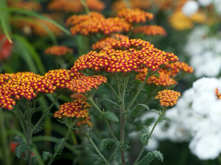 An ideal back border plant. This slug proof yarrow has clusters of small yellow-red flowers which are high in nectar/pollen between June and September, which attract bees and other beneficial insects. Hardy to -10 Achillea shows new growth in spring and thrives in sun to partial shade, also is draught tolerant.