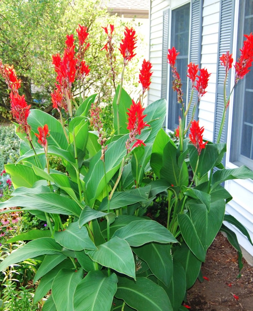This particular variety is a vibrant perennial that produces bold tropical foliage and striking flowers of flame red. In southern areas of the UK if cut back and mulched in winter can stay outside. Can grow up to heights of 1.8m and 1m wide. Canna are low maintenance and produce long lasting foliage and flowers throughout the summer and autumn.It can tolerate extensive periods of heat, loving full sun and well drained soil. I find the best position is an area in the garden that has some shade in the afternoon. Cannas originate from the Peruvian coast of South America.