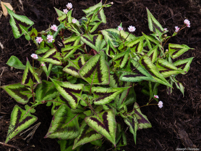 A vigorous, impressive, deciduous, perennial with bright lance shaped purple-green leaves with a bold central splash of purple and then bordered with silver chevron markings. Although vigorous this Persicaria will not spread and prefers partial shade especially in the hottest part of the day. Ideal for jungle planting scheme, but can find its place in most types of gardens.