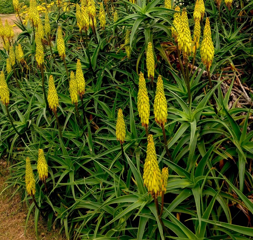 This impressive South African species is remarkable for its general toughness, it can survive dry summers and frosty winters and can grow outside in most uk areas. In summer it produces dramatic yellow spikes similar to Kniphofia, which bees find very attractive. Mature plants are approximately 60cm high and can spread to around a metre. Place in full sun with a sharply draining soil.