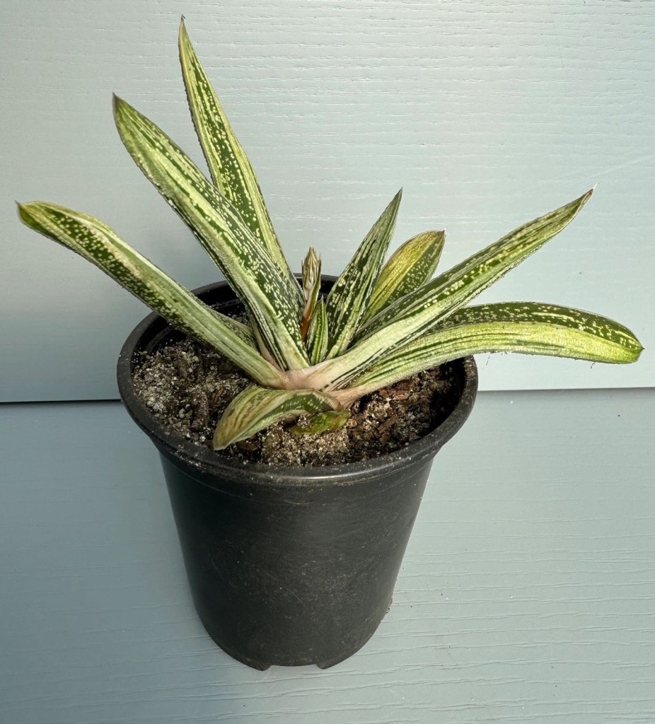 This is a well known funky little succulent has lovely light green leaves with white spots in vertical lines. The leaves are thick and fleshy. It can be fairly fast growing producing lots of offsets creating a large clump around a main mature plant. It grows to about 12cm high and 10 cm wide, prefers indirect sun light, little water and temperatures between 18-24C. As all Gasteria they can be toxic if consumed and originate from South Africa.