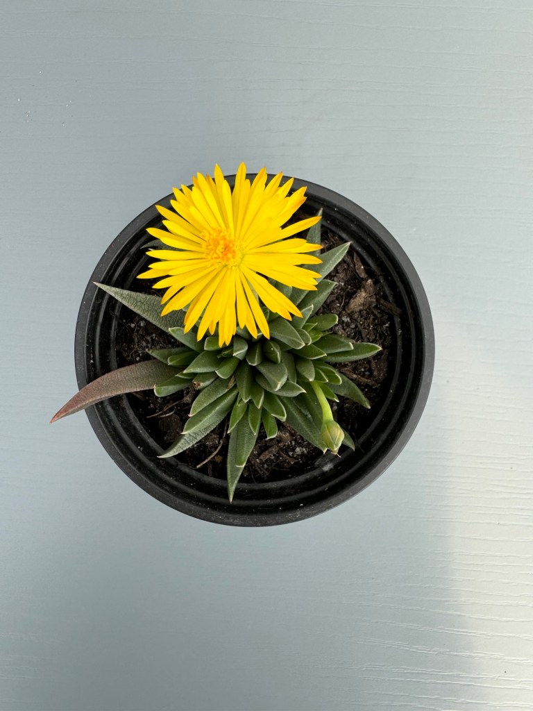 This lovely delicate flowering succulent grows on the sandstone outcrops on the Eastern Cape in South Africa. It is a very low growing variety, reaching just 10cm high and grows on a single fleshy rootstock that expands with age. The leaves are triangular in cross section and fleshy green with vivid yellow flowers that appear in spring, which bees and butterflies adore. Prefers full sun but can tolerate partial shade. Requires a sheltered location with free draining compost with plenty of grit. Not frost hardy.