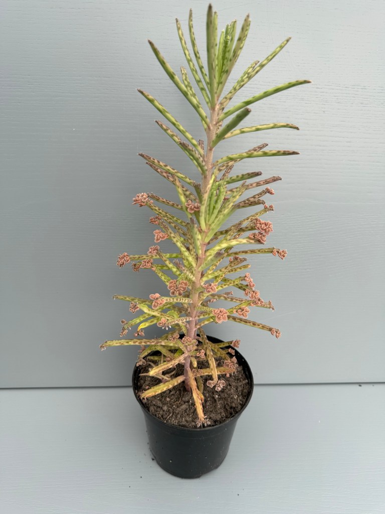 An evergreen, drought tolerant, succulent, shrublet. It grows in an upright habit on a single fleshy green stem, which is very fine and tube like. Native to Madagascar, the leaves are pale silver green and vary in shades depending on amount of water and sunlight. On the edge of tube shaped leaves plantlet form.